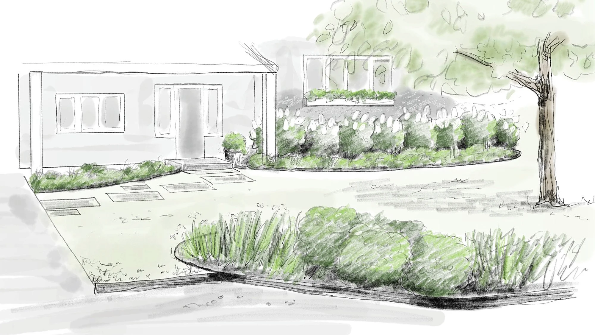 The city's stormwater bump-out is integrated into the front yard design so it doesn't look tacked on.