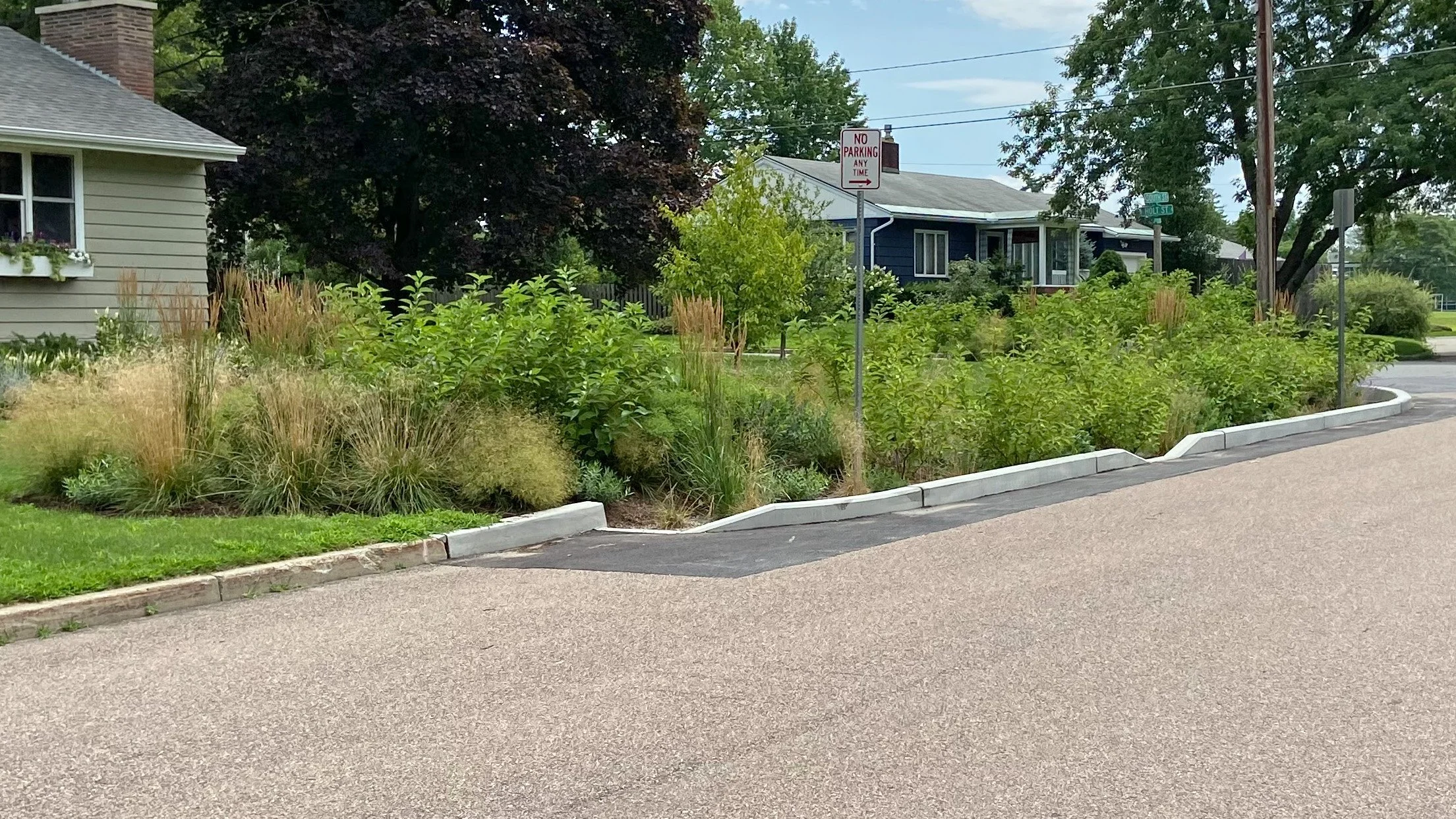 In some cities, the stormwater bump-outs look like weedy ditches. Not at this Burlington site. Here, the grassy swale enhances the front yard from foundation to curb.